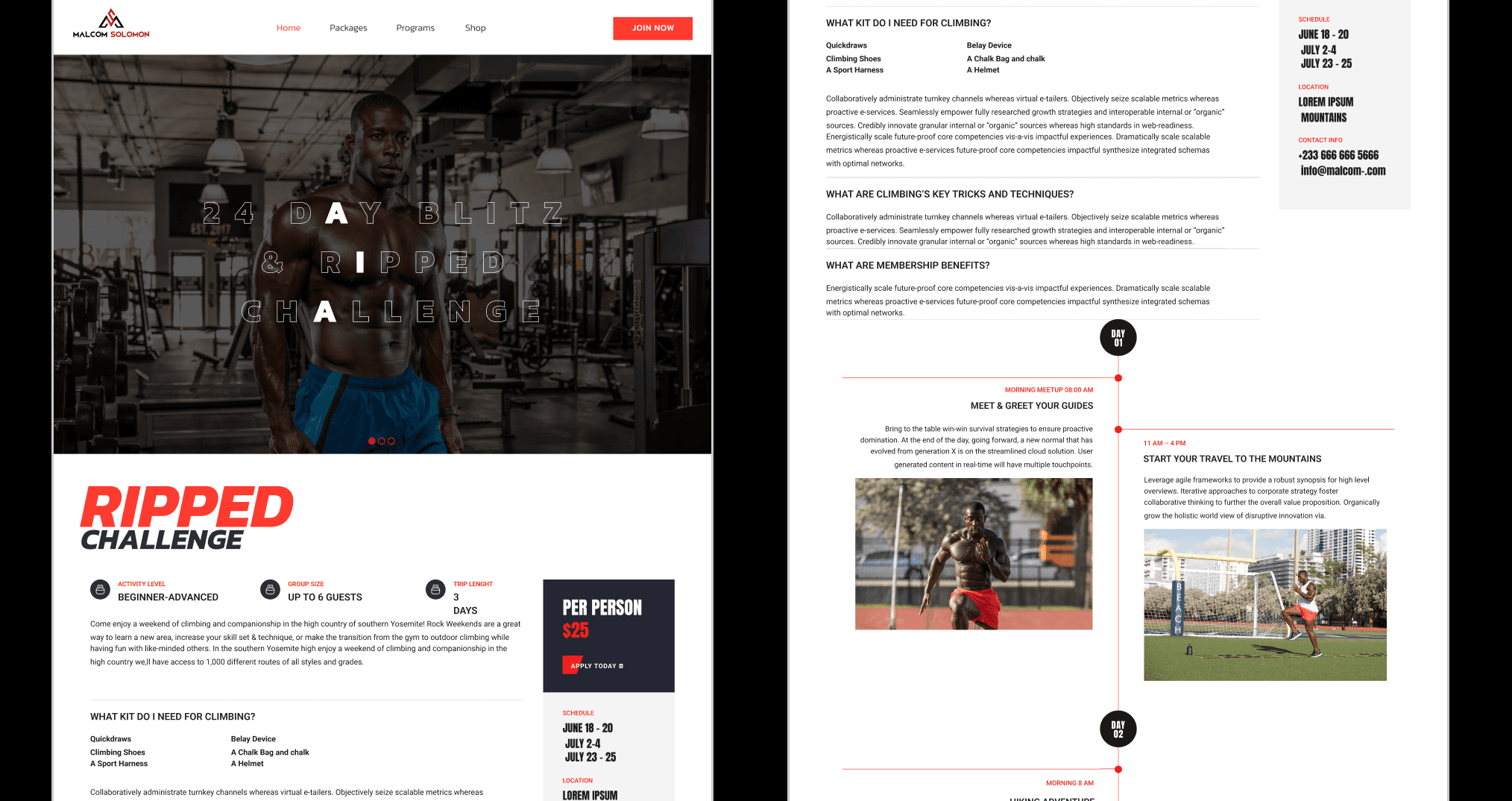 1. Develop a visually striking and user-friendly fitness website. 2. Design dedicated pages for Home, Packages, Programs, and Shop. 3. Cater to fitness enthusiasts seeking personalized workout programs and merchandise.