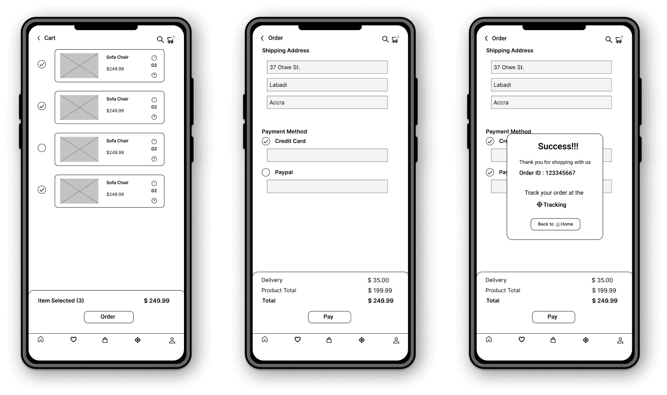 Design an app for TradeByKofi that enables users to quickly browse furniture, place orders, track orders, and have items delivered to their homes.