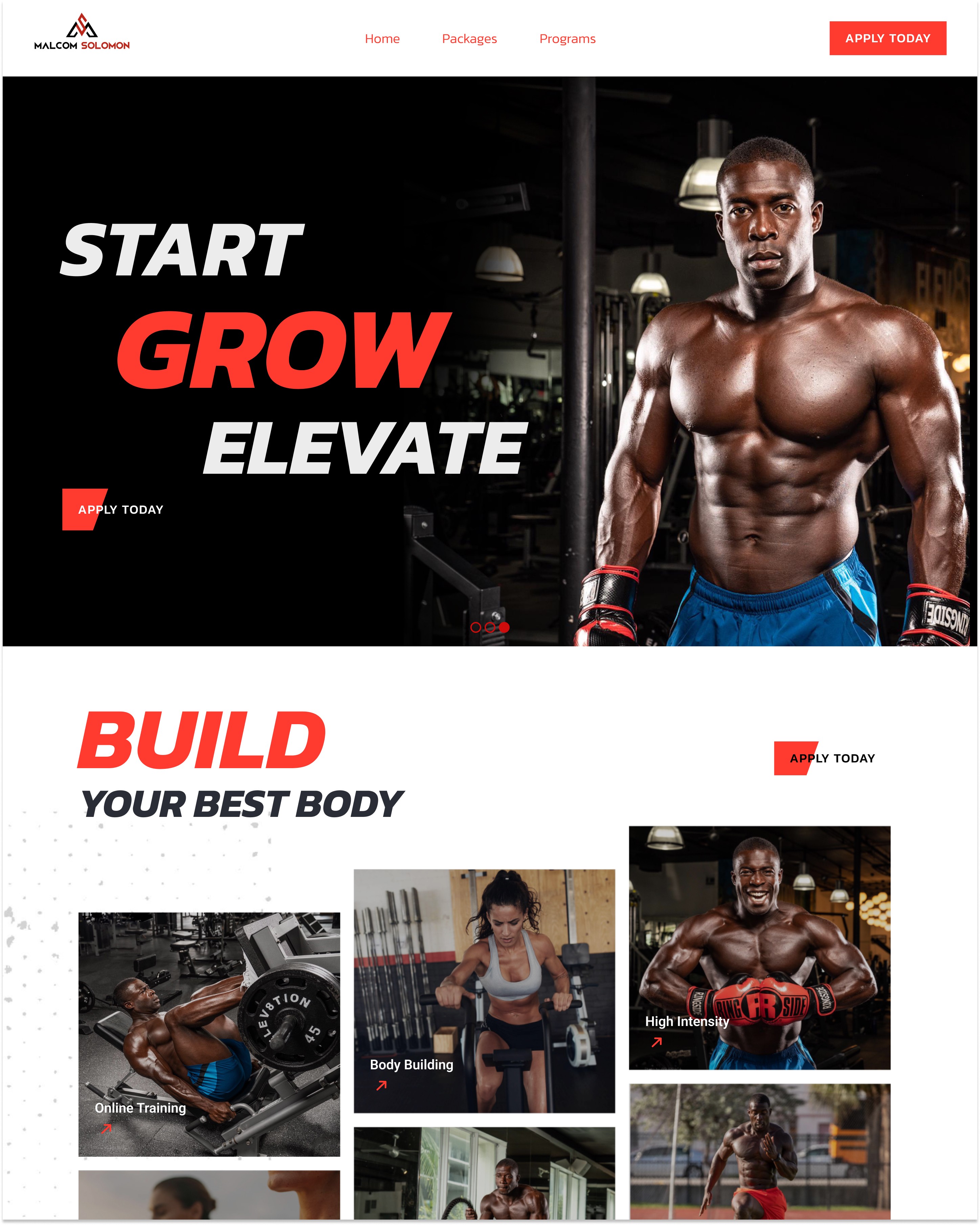 Malcom fitness website, features pages for workout programs, fitness challenges, merchandise shop, and personalized fitness plans to inspire and engage users to workout.